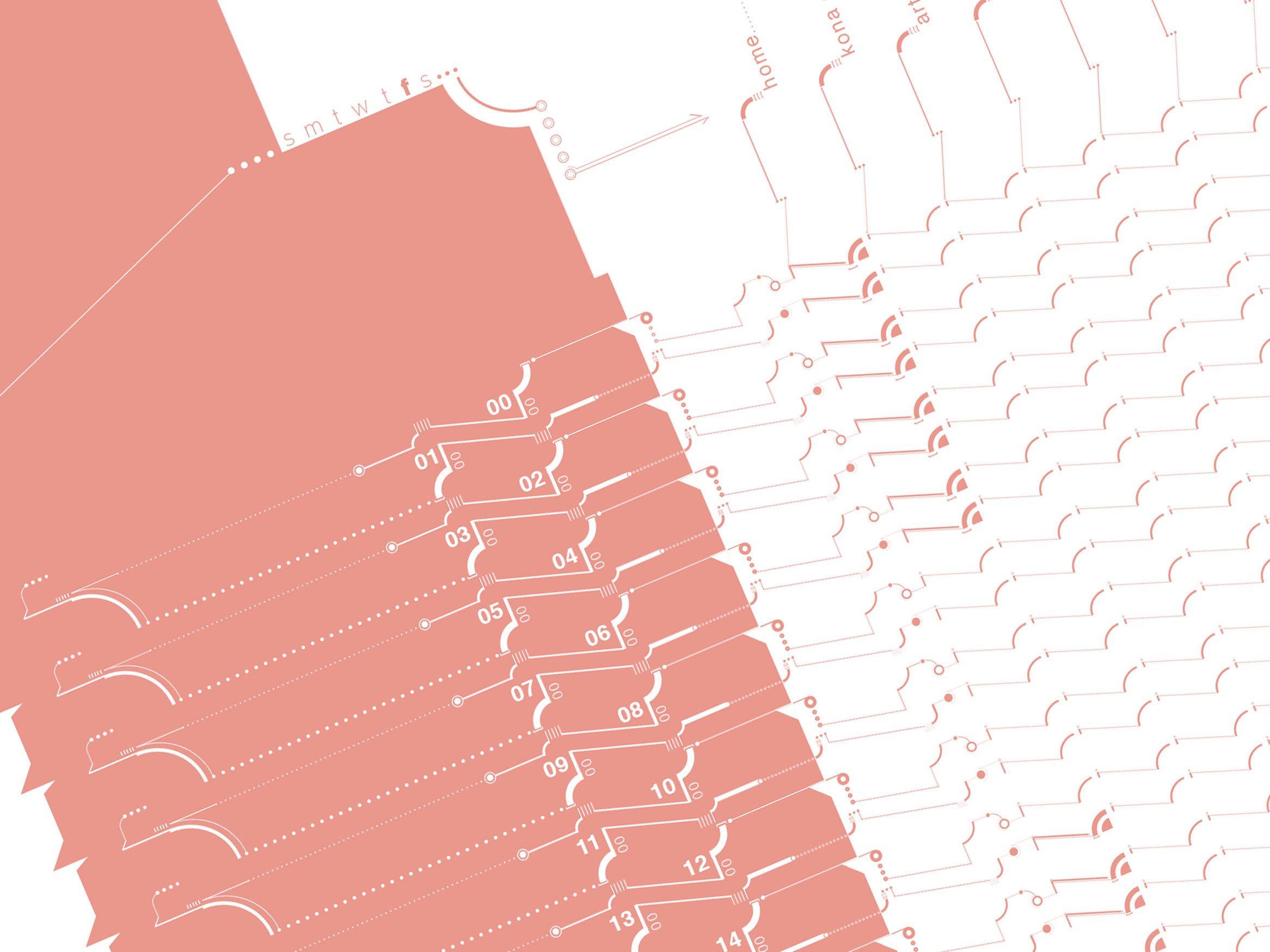 The daily routine was designed as a timeline with three different categories. 1) location, 2) content, and 3) priority. The goal was to create a consistent structure using a system of typographic marks, while at the same time keeping separate information distinct and legible. Data must be collected, organized, prioritized, and assembled into a visual format that aims to be intelligent and informative.