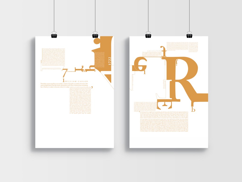 The project focused on William Caslon, an American typeface designer active at the beginning of the 20th century, and, taking into context the period in which he lived, two posters were created using examples of the major typefaces he designed. The project emphasized typography, no images, and the importance of maximizing Caslon’s designs.